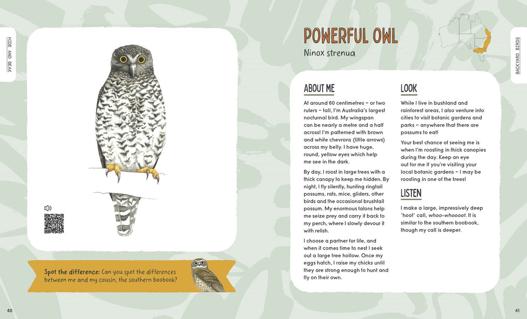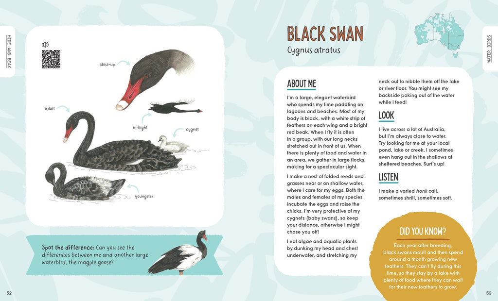 Australia is home to around 800 native birds. In Hide and Beak, author and bird-lover Georgia Angus identifies the most common birds to spot in your very own backyard. Each profile talks about the bird's personality, what it eats and where it can be found. You can even listen to its birdcall by scanning a QR code! Learn how to be a birdwatcher and examine beaks, feed and feathers. With realistic illustrations and comparisons with twin-like birds, you'll be an expert birdwatcher before you know it!